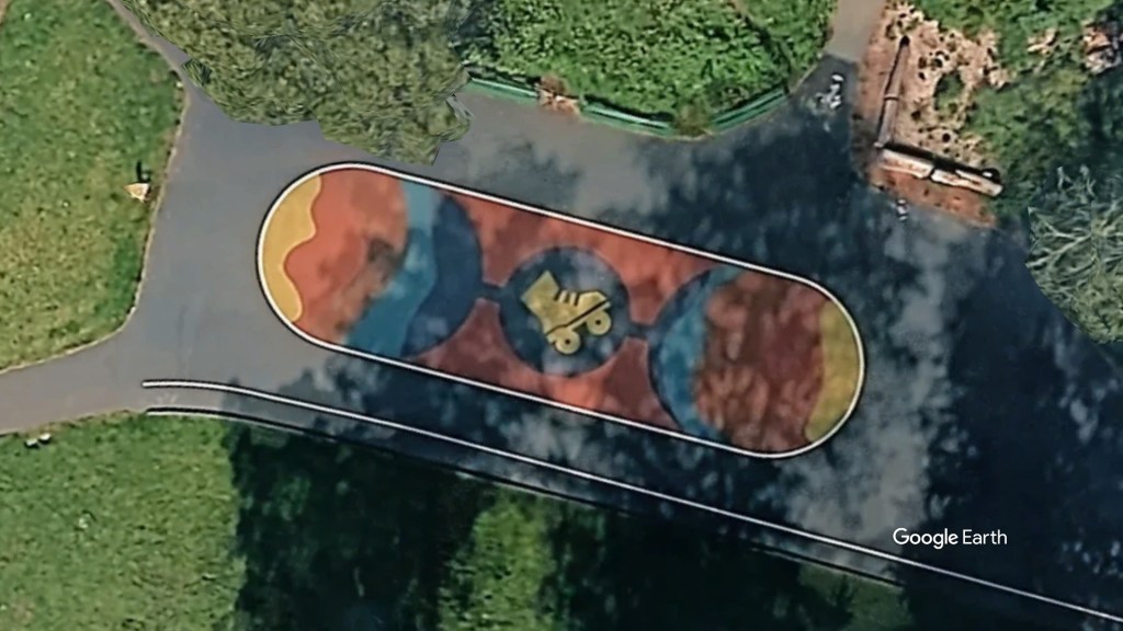Fun fact: The mural wasn’t painted. It was built using colored asphalt to preserve the smooth surface skaters need, while also ensuring durability. That technical feature shaped the minimalist design.